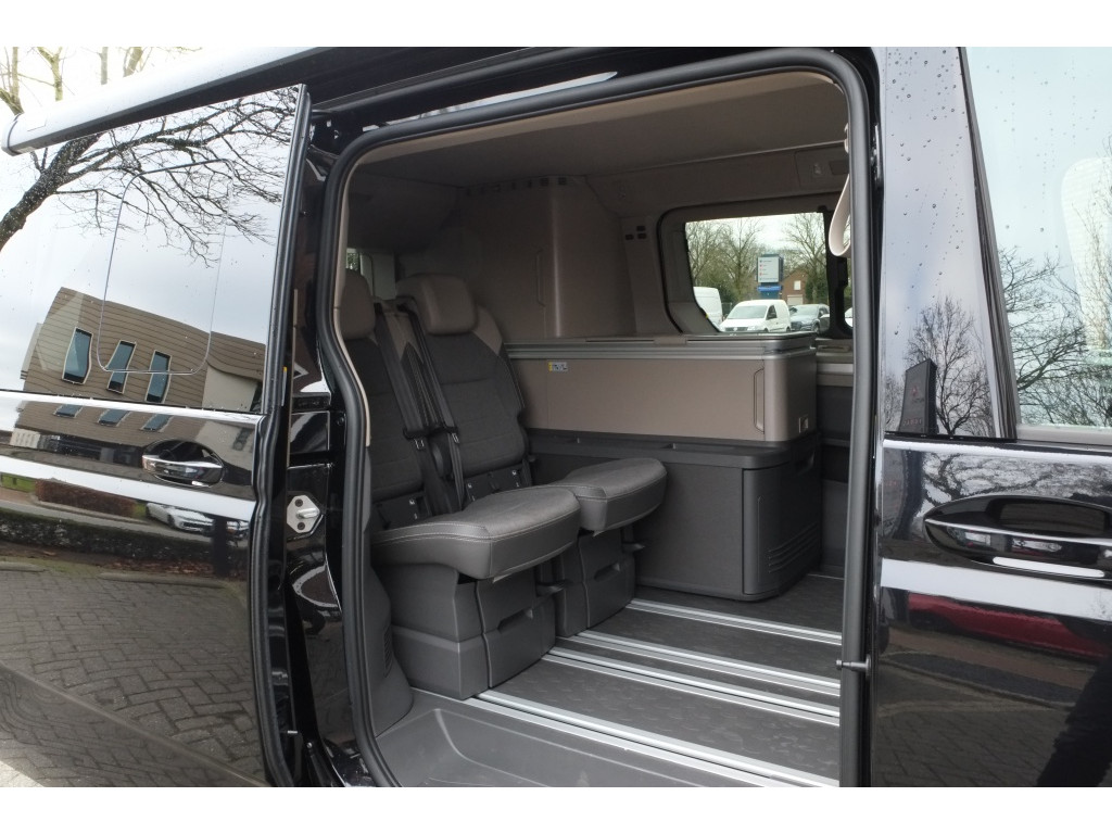 Deze stoere Volkswagen California Ocean in een elegante zwarte kleur straalt stijl en klasse uit. De metallic lak geeft de auto een luxe uitstraling, terwijl de zwarte behuizing en luifellijsten van de luifel extra elegantie toevoegen. De schuifdeuren aan zowel de laad- als passagierszijde zijn elektrisch bediend, wat het in- en uitstappen tot een fluitje van een cent maakt. Bovendien zorgen deze schuifdeuren voor een ruim en comfortabel interieur, zodat je optimaal kunt genieten van elke rit.